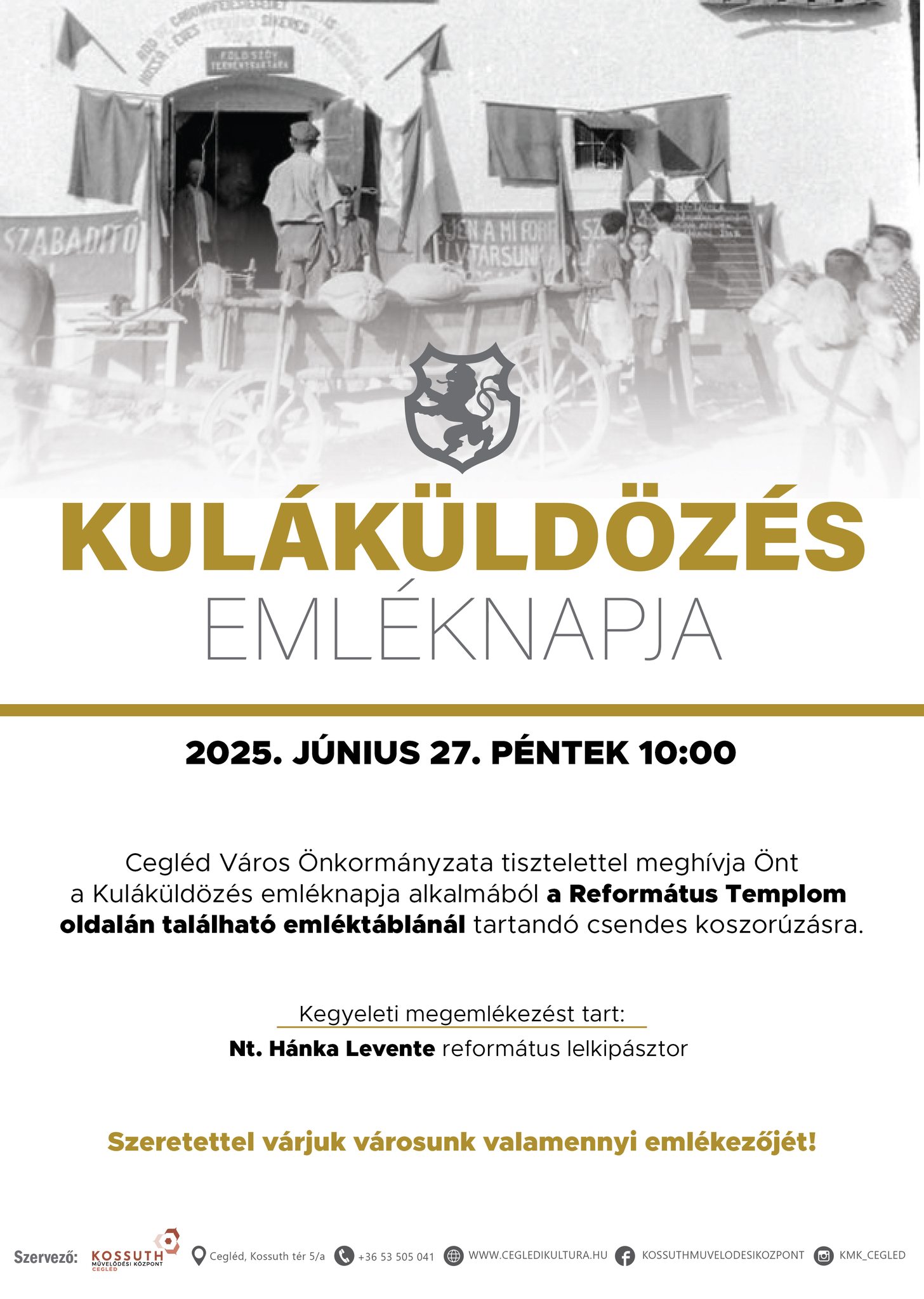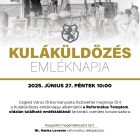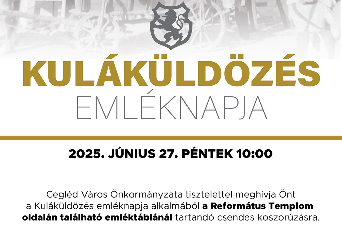 Időpont: 2025. június 27. péntek 10:00 Cegléd Város Önkormányzata tisztelettel meghívja Önt a Kuláküldözés emléknapja alkalmából a Református Templom oldalán található emléktáblánál tartandó csendes koszorúzásra. Szeretettel várjuk városunk valamennyi emlékezőjét!