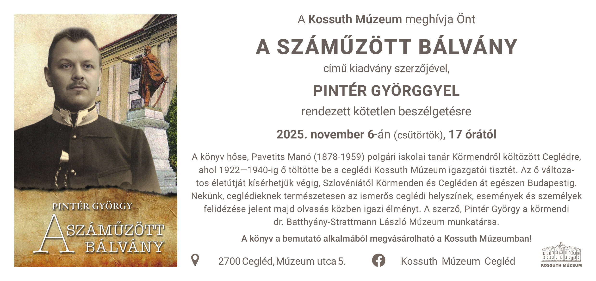 Beszélgetés A száműzött bálvány című kiadvány szerzőjével A Kossuth Múzeum meghívja Önt 2025. november 6-án (kedden) 17 órára A száműzött bálvány című kiadvány szerzőjével, Pintér Györggyel rendezett kötetlen beszélgetésre.