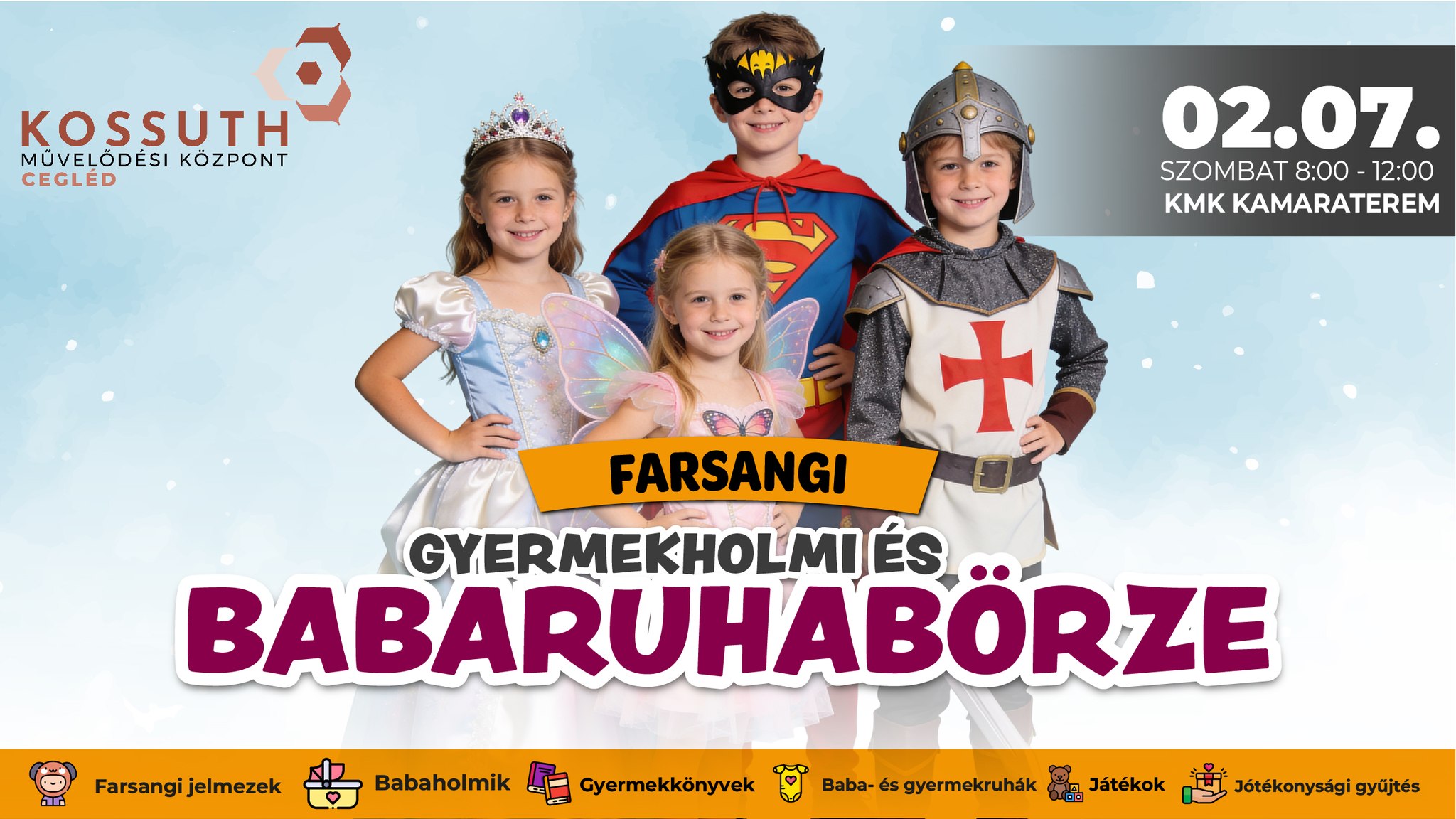 – farsangi jelmezek – babaruhák – gyermekruhák – gyermekkönyvek – játékok – jótékonysági gyűjtés Az asztalfoglalás előzetes jelentkezéshez kötött. KMK Jegypénztár Kapcsolódó képek |