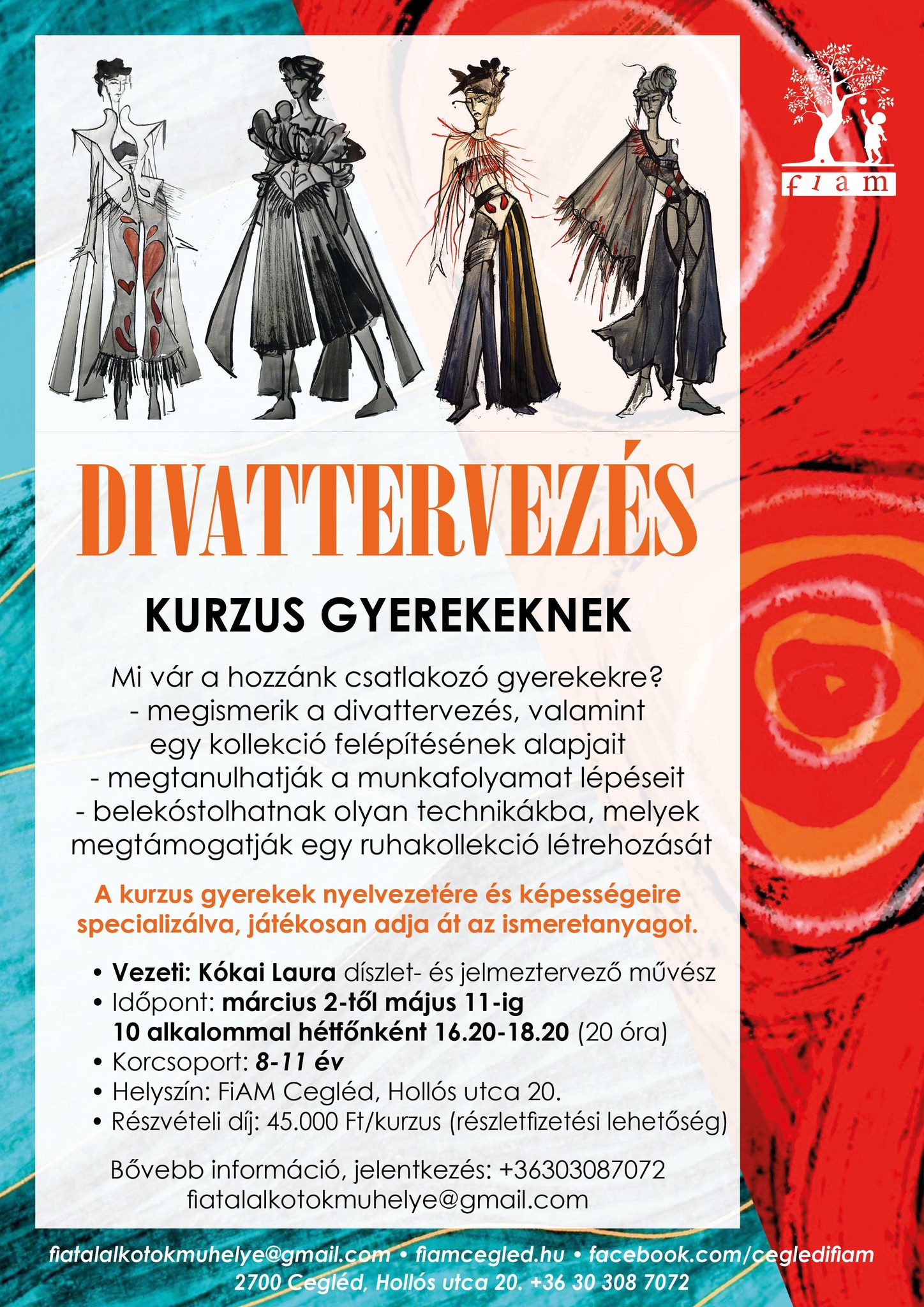 • Korosztály: 8-11 év • Időpont: március 2-től május 11-ig 10 alkalommal hétfőnként 16.20-18.20 (20 óra) • Helyszín: FiAM Cegléd, Hollós utca 20. • Részvételi díj: 45.000 Ft/kurzus (részletfizetési lehetőség) • Bővebb információ: +36303087072 fiatalalkotokmuhelye@gmail.com • Jelentkezés online: https://forms.gle/u4aV4mf9w6dV9nDC9 További részletek: