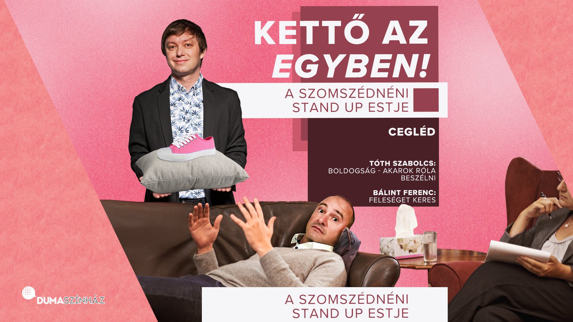 A boldogságot érdemes keresni vagy inkább feleséget? A Dumaszínház az év önálló előadásának választotta Tóth Szabolcs „Boldogság – Akarok róla beszélni”, valamint kollégája „Bálint Ferenc feleséget keres” estjét, amit a Szomszédnéni humoristái együtt visznek a közönség elé „Kettő az egyben!” címmel. Tóth Szabolcs megpróbálja megfejteni, mi volt nagyobb boldogság: az első szerelem, egy tengerparti nyaralás vagy palackot címkézni egy palackozóüzemben? Miért téved az ember az alkohol vagy a kábítószer zsákutcájába, és miért ne menj oda biciklivel? Bálint Ferenc elpanaszolja, hogy soha nem próbálta ki a Tindert, a Bumblet, meg a többi társkeresőt, mert a felesége nem engedte neki. Kiderül, hogy miért utálja Tom Cruiset, mi kell ahhoz, hogy ő legyen a férfi a házban, és hogyan kell túlreagálni dolgokat. Egy jegy áráért most együtt, mindkét önálló est megtekinthető. A hülyének is megéri.
